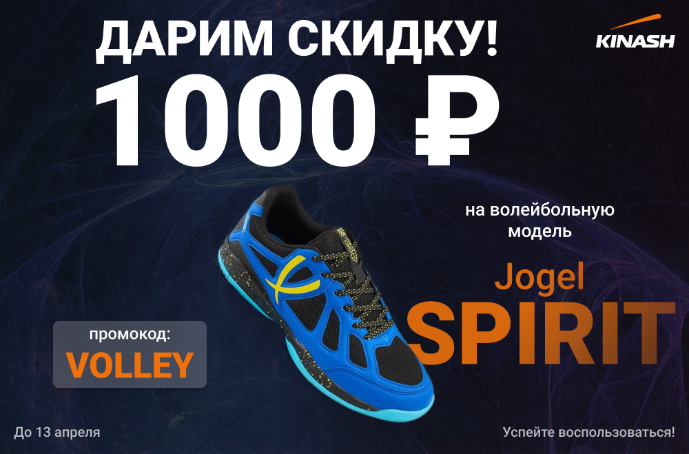 До 13 апреля (включительно), по промокоду «VOLLEY» - будет действовать скидка 1000₽ на волейбольные кроссовки Jogel Spirit.