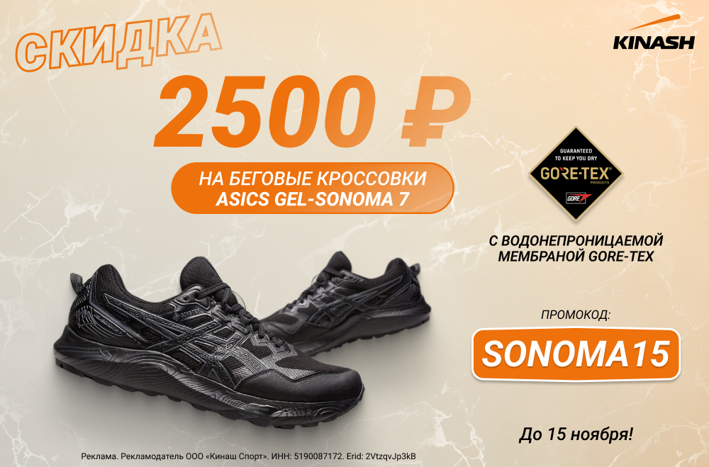 Дождь — не повод отменять прогулку или пробежку, когда есть кроссовки с водонепроницаемой мембраной Asics GEL-SONOMA 7, а мы подарим на эту пару скидку 2500 рублей.