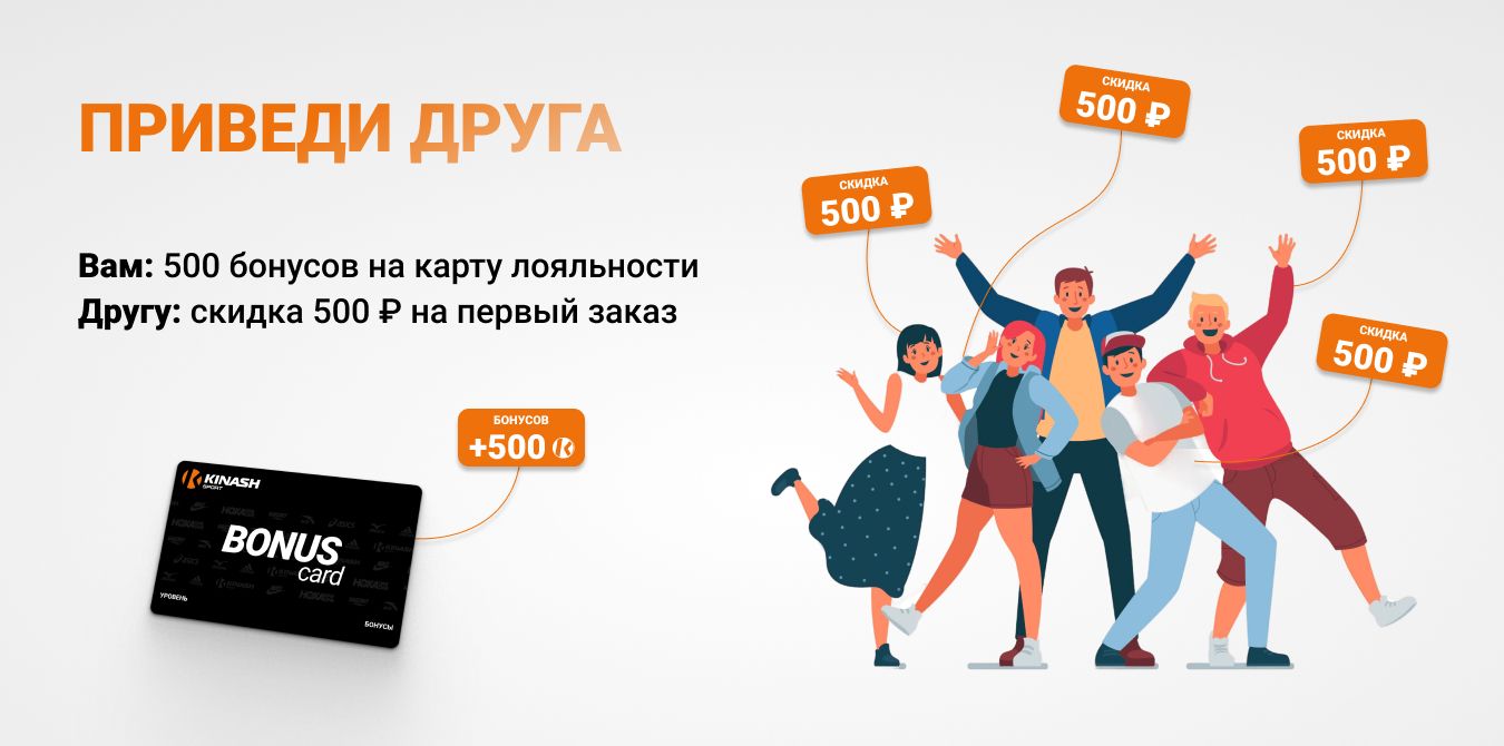 После совершения первой покупки друга с использованием данного кода - тебе будут начислены 500 бонусов на карту лояльности.